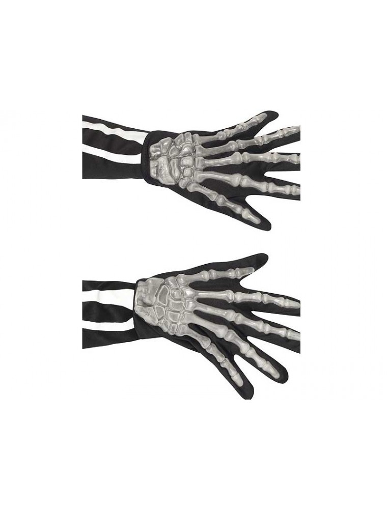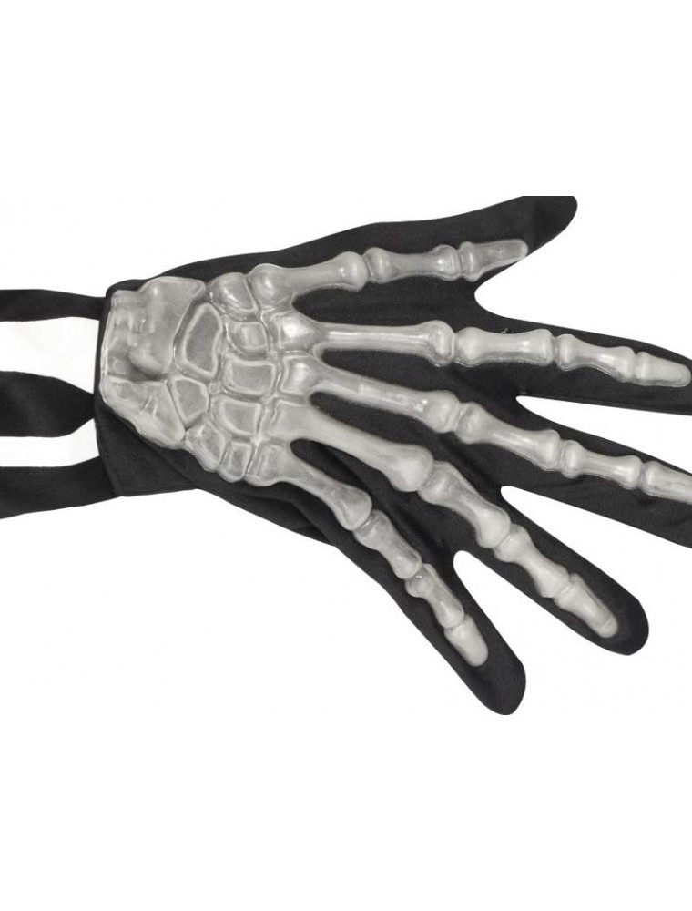 O pereche de manusi din material textil negru care au atasate in partea superioara imitatii din plastic ale oaselor scheletului mainii umane. Elementele de plastic sunt pudrate cu un praf fosforescent care maresc foarte mult efectul ingrozitor ![]()
