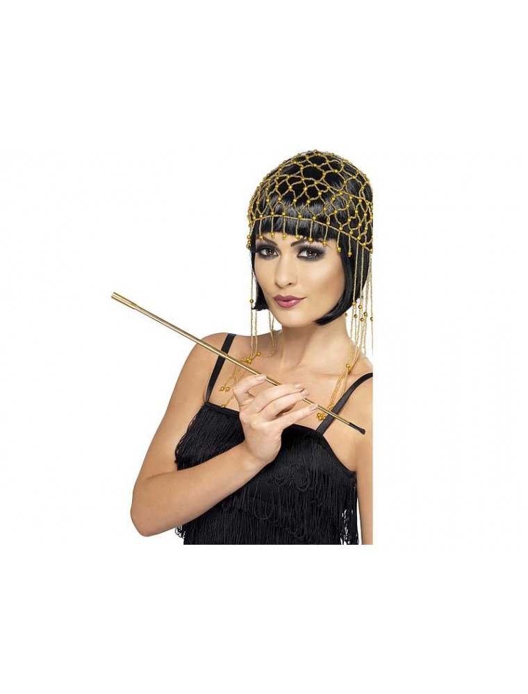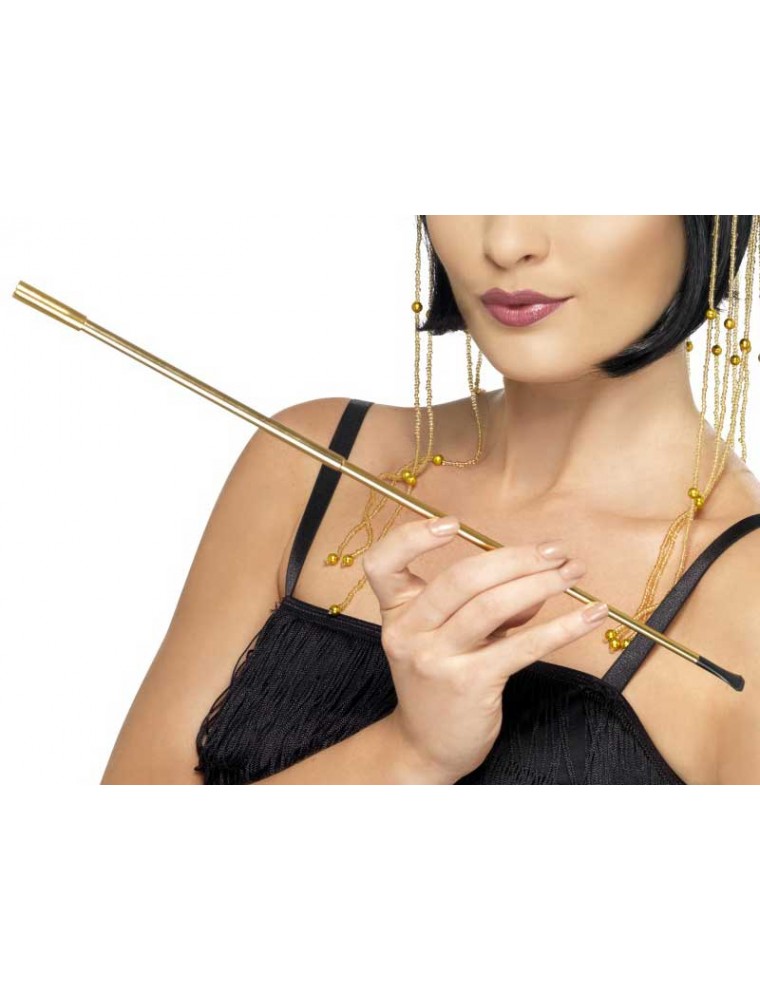 Port-tigaret auriu extensibil confectionat din metal cu mustiuc de plastic negru.