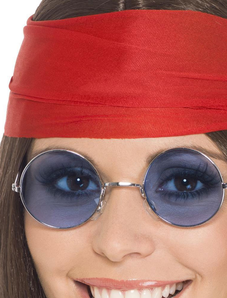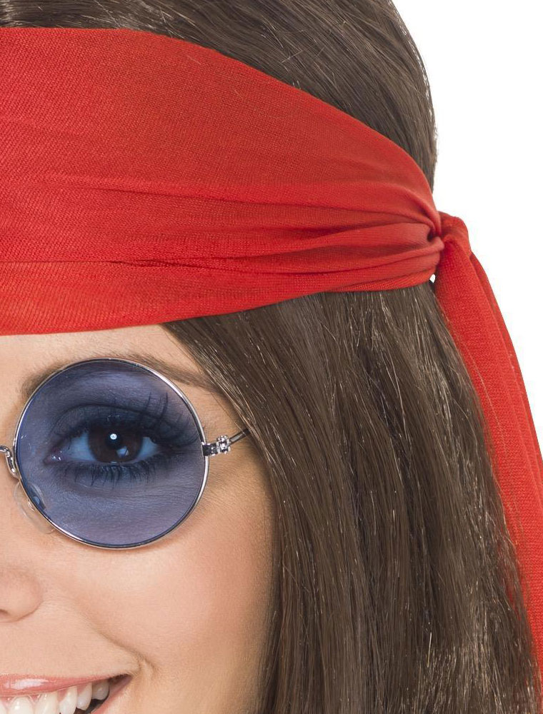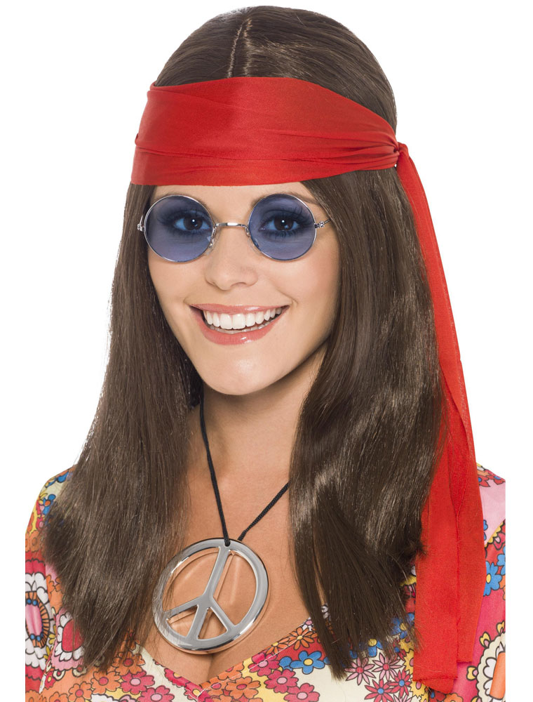 Set Hippie compus din peruca cu cu bandana rosie, medalion cu semnul pacii si ochelari rotunzi model John Lennon.