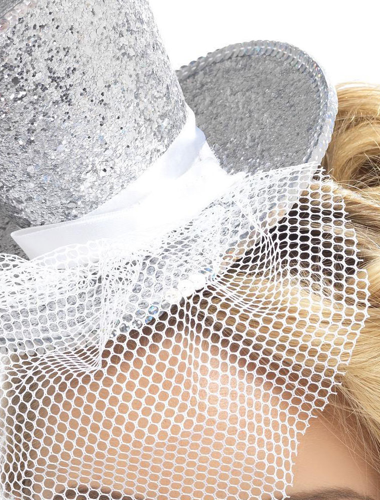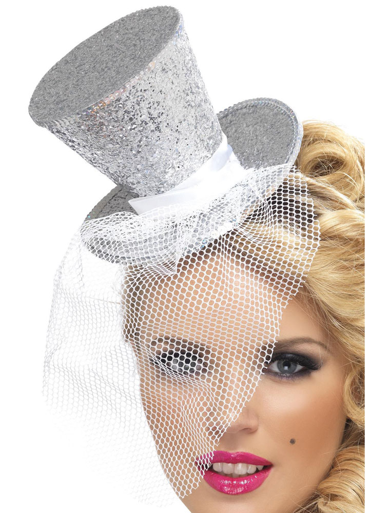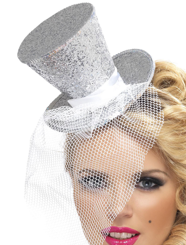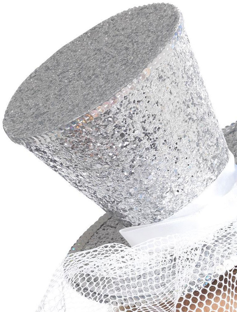 Minijoben Sexy Cabaret argintiu, cu sclipici lipit solid pe toate suprafetele, paiete cusute la margini, bentita elastica pentru fixare si voal de dantela alba.