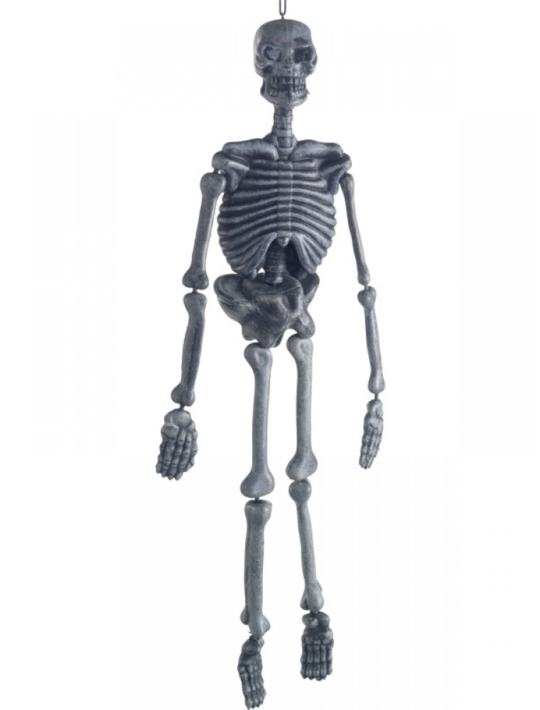 Schelet decorativ de 60 cm inaltime cu articulatii mobile si un siret care ii iese din cap pentru a putea fi agatat oriunde.