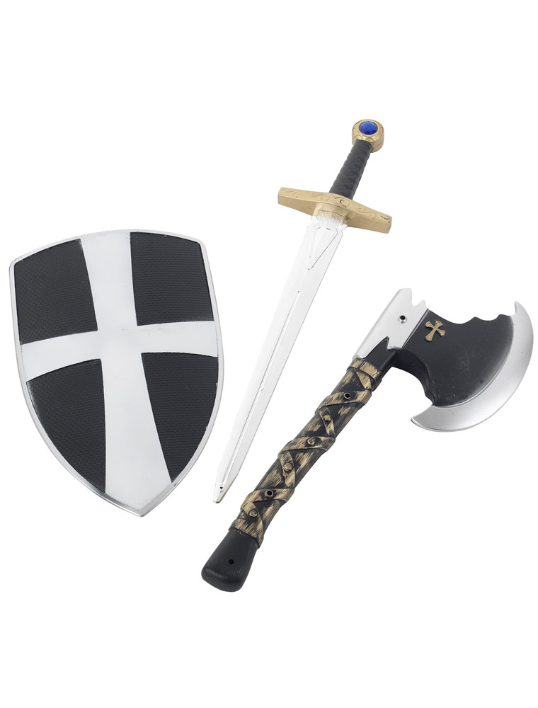 Setul contine scut, sabie si topor de lupta.