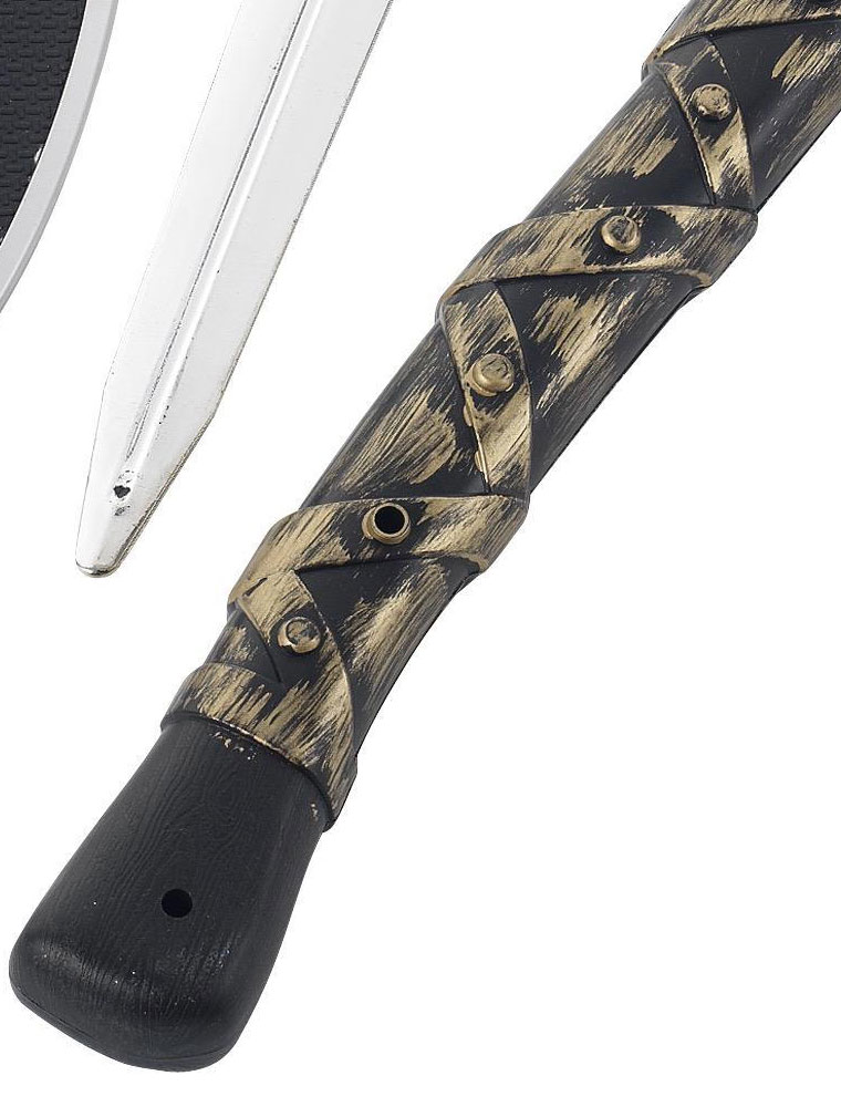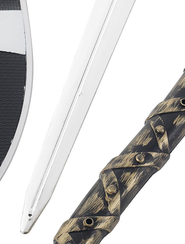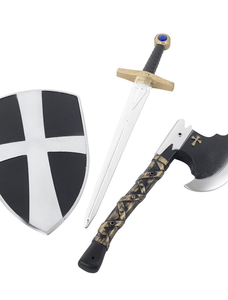 Set de arme medievale executate din plastic ideale pentru completarea costumatiei de cavaler medieval, cruciat sau print luptator.