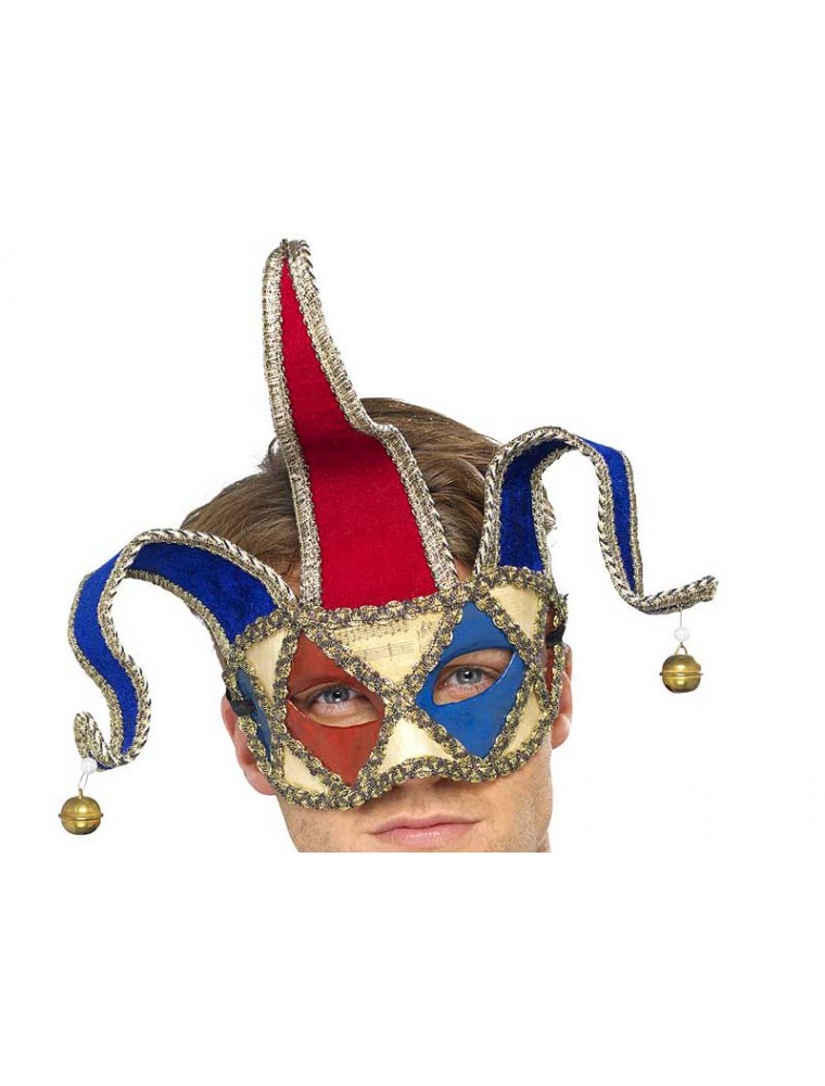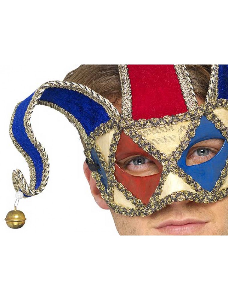Masca venetiana Arlechin confectionata din materiale de calitate, mulaj de gips vopsit si lacuit, ornat cu dantela aurie si trei "plete" de catifea rosie si albastra fiecare cu cate un clopotel metalic in varf.