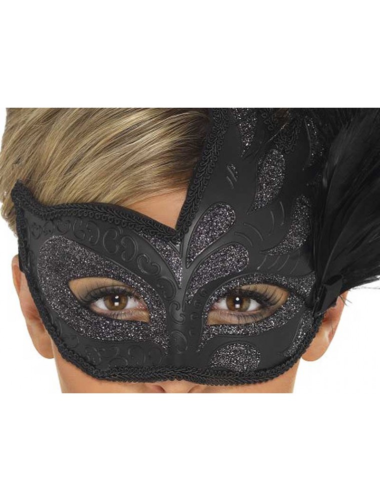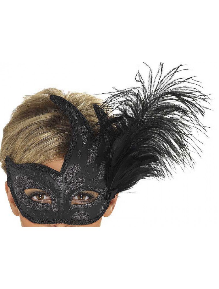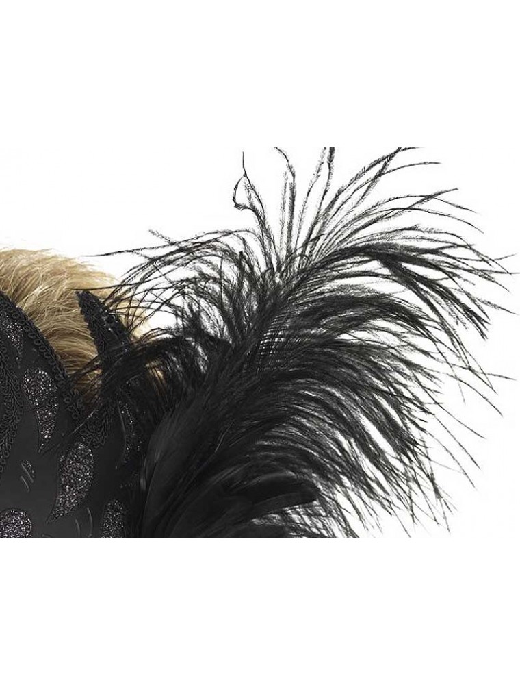 Masca venetiana Columbina neagra confectionata din materiale de foarte buna calitate, mulaj de plastic negru ornat cu modele de lac stralucitor, fir de satin negru pe margini, fulgi si pene negre de strut.