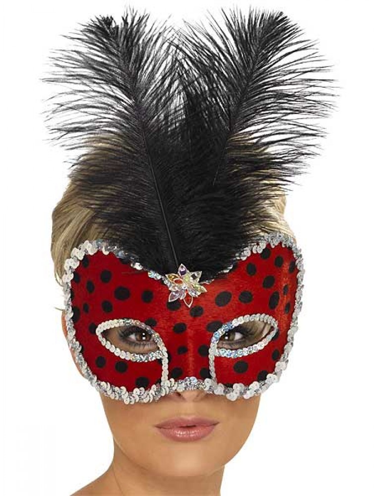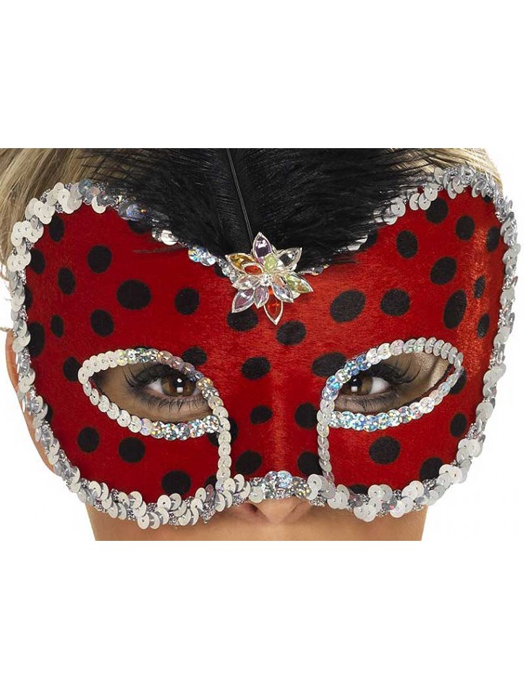 Masca venetiana Ladybug confectionata din cele mai bune materiale, mulaj nerigid acoperit cu satin rosu cu picatele rosii, ornat pe margini cu paiete, in frunte o bijuterie florala cu imitatie de pietre pretioase si doi fulgi de strut negru autentice.