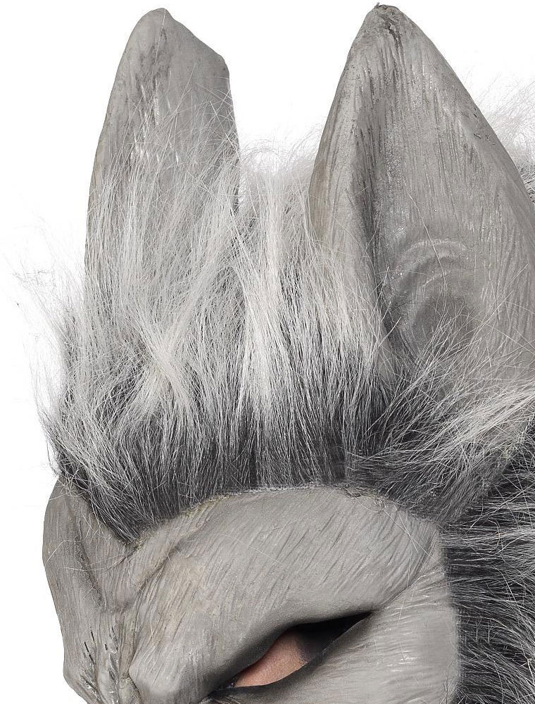 Executata din latex si vopsita cu coloranti netoxici masca are aplicat si par artificial.