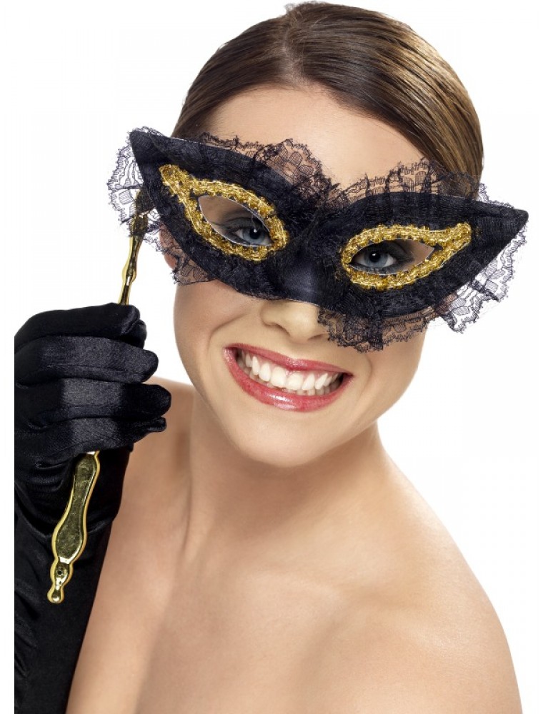 Masca pentru ochi cu maner confectionata din carton plastifiat, dantela neagra, broderie aurie si un maner de plastic auriu.