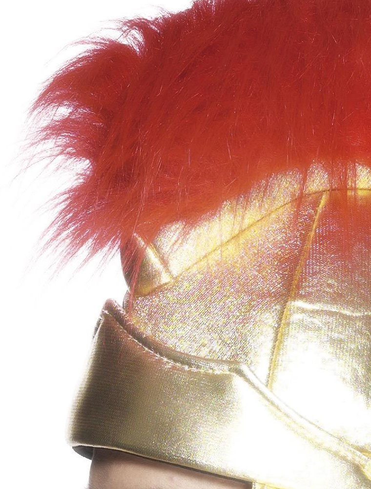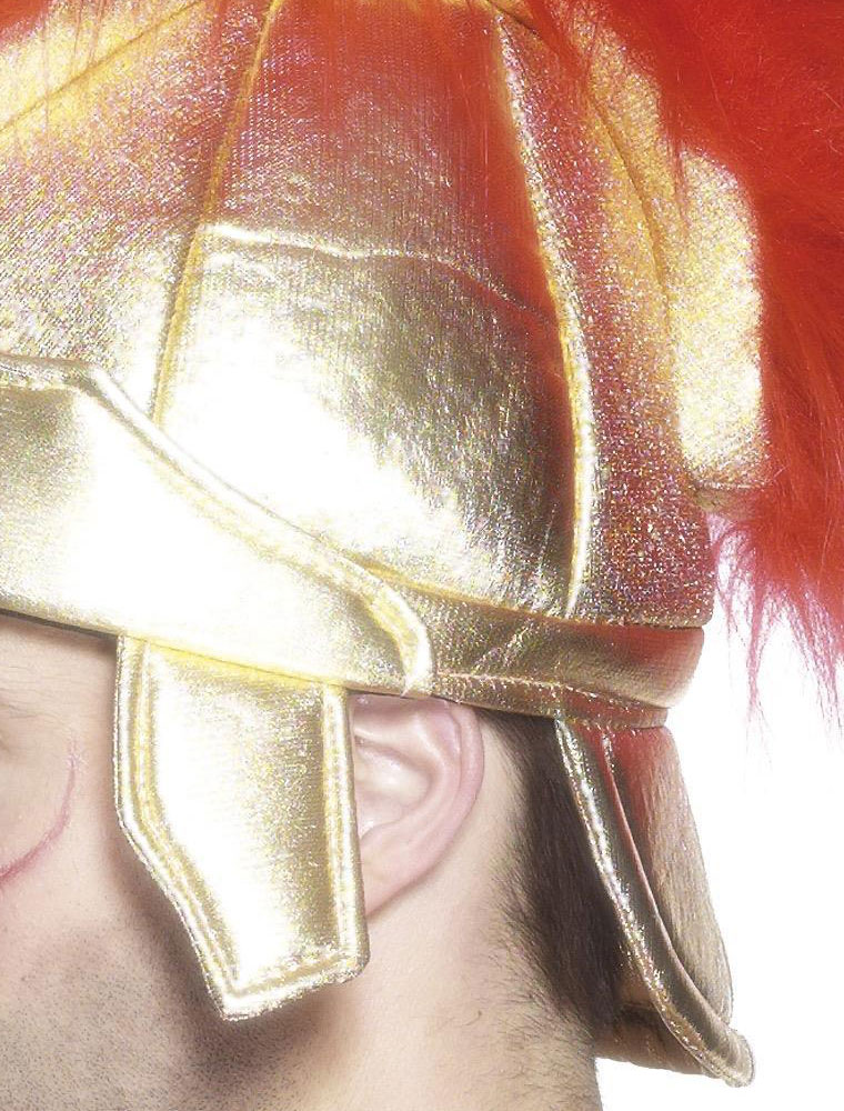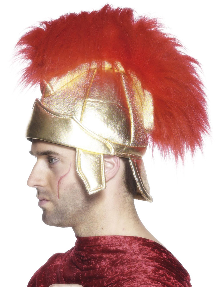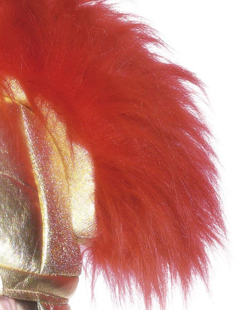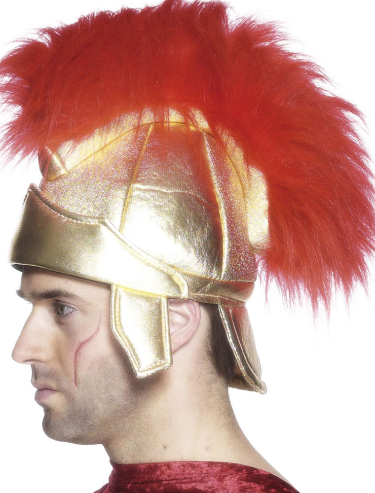 Casca de soldat roman confectionata din material buretos captusit la exterior cu textil auriu si impodobita cu o creasta rosie din par artificial.