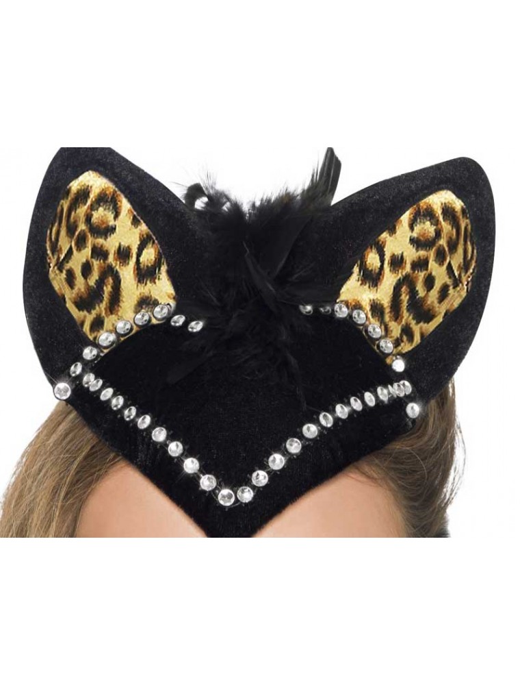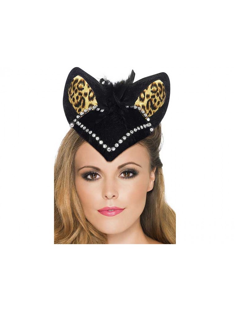 Palarie Burlesque Kitty confectionata cu indemanare din catifea neagra aplicata pe fetru cartonat negru, ornata cu elemente de plastic care imita pietrele pretioase albe si fulgi cu puf negru. Interiorul urechiuselor este din satin cu leopard-print. Se fixeaza usor pe cap cu ajutorul unui elastic negru elegant si discret.