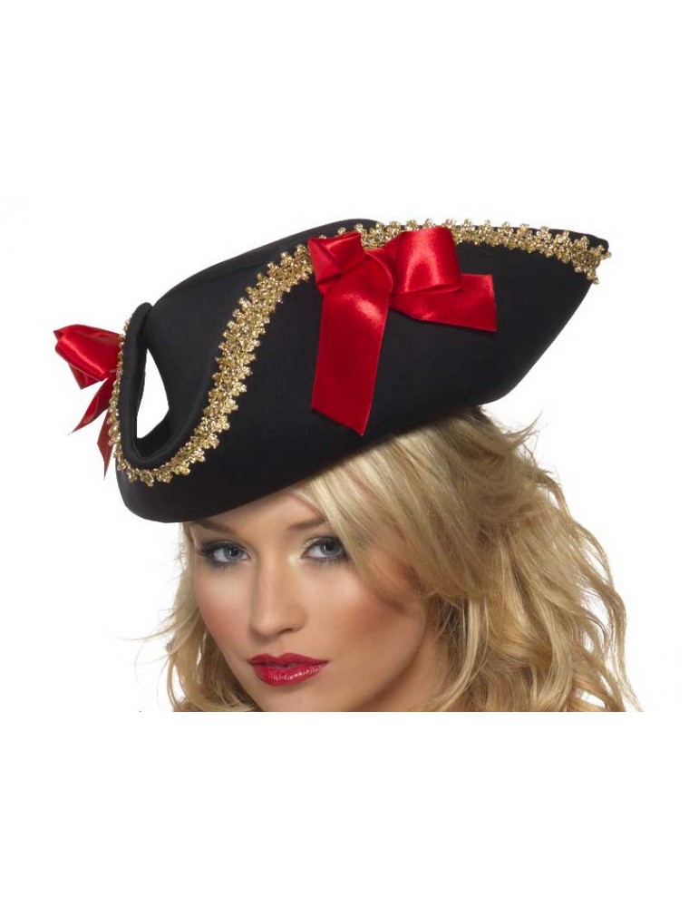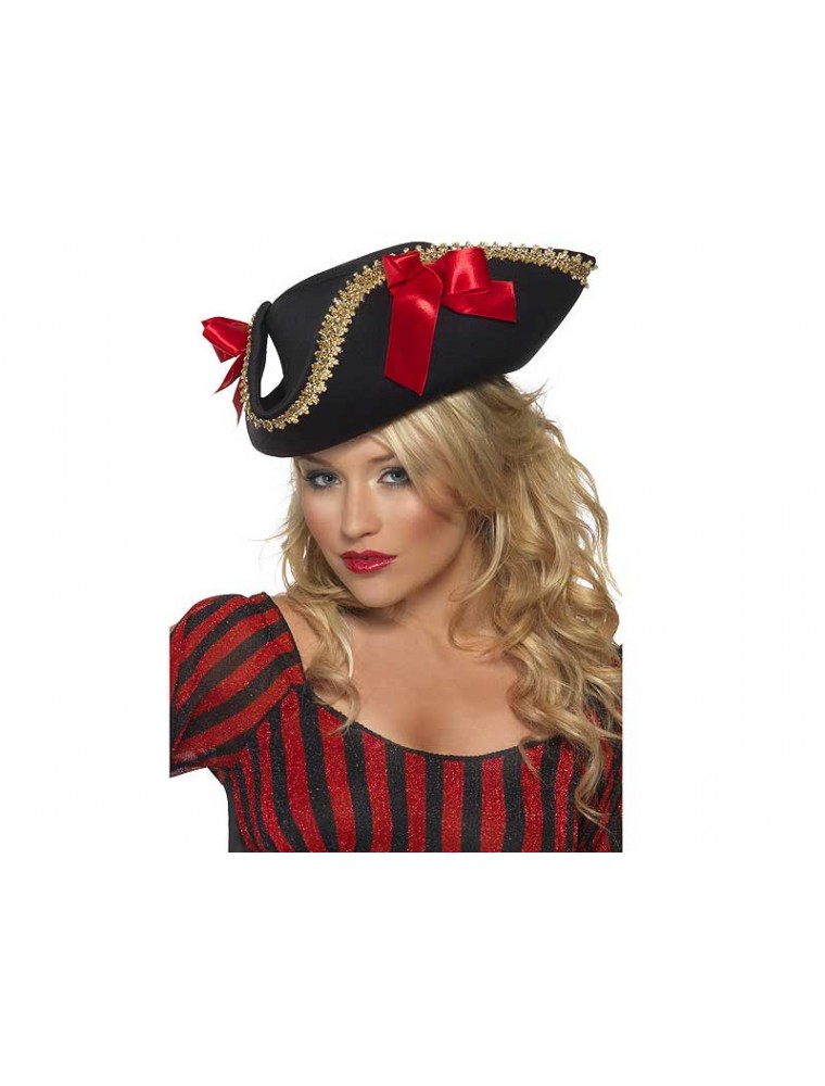 Palarie Pirat Fever confectionata din material textil negru buretat cu broderie aurie pe margini si doua funde rosii din banda de satin lata.
