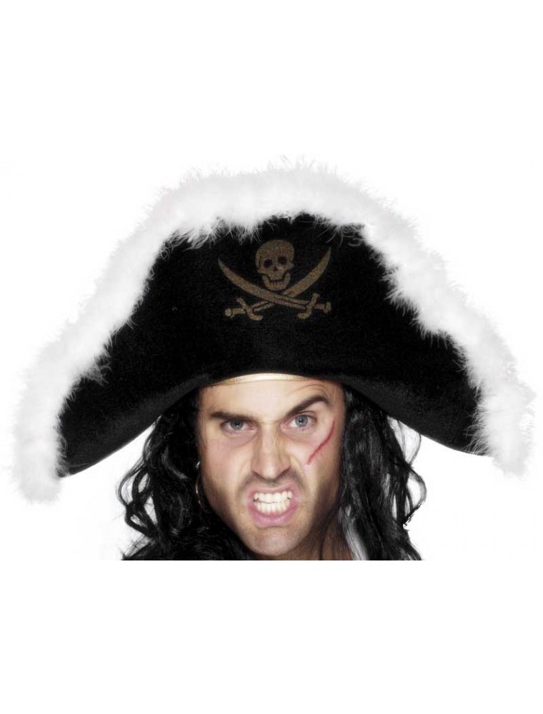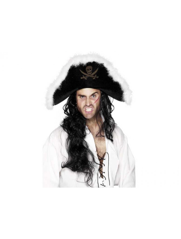 O palarie de pirat din catifea si puf alb. marime pentru adulti (peruca si restul accesoriilor nu sunt incluse).