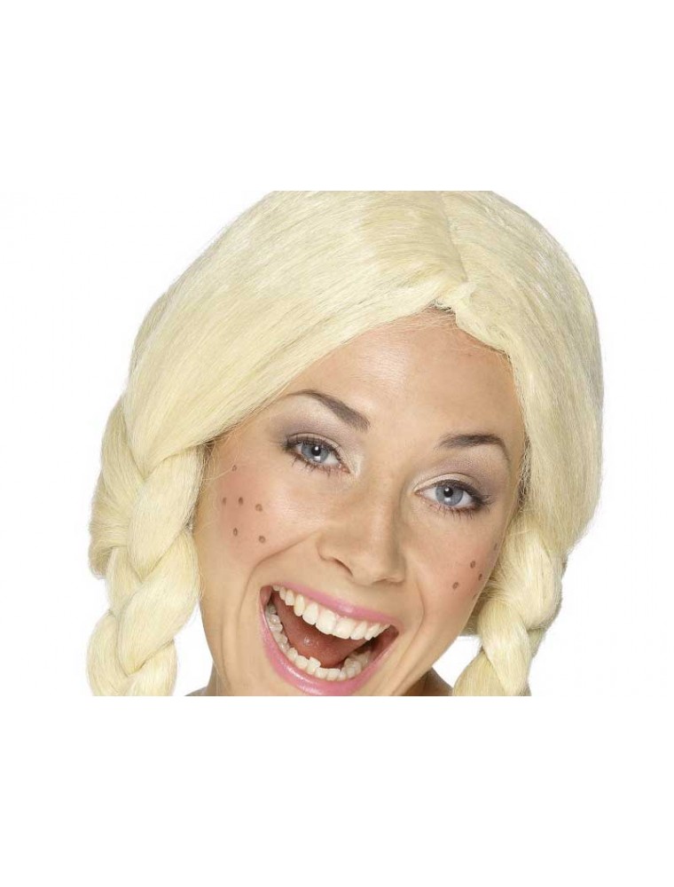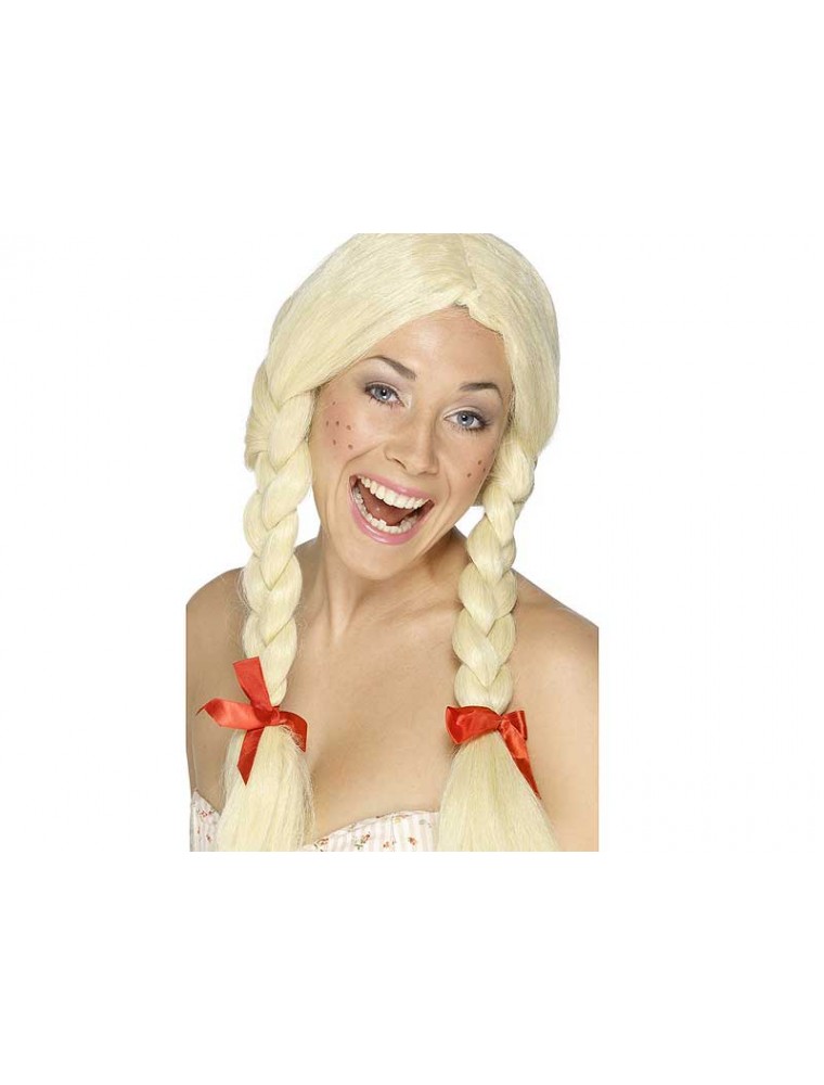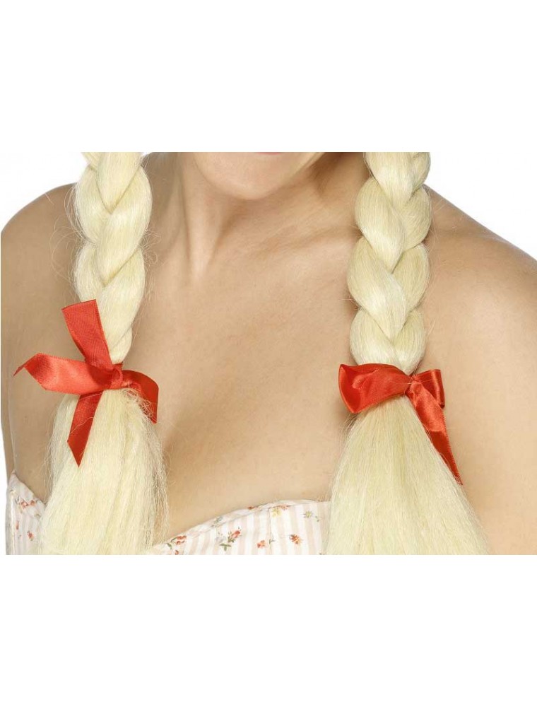 Executata din par artificial blond aranjat in 2 codite impletite si prinse cu fundite rosii.