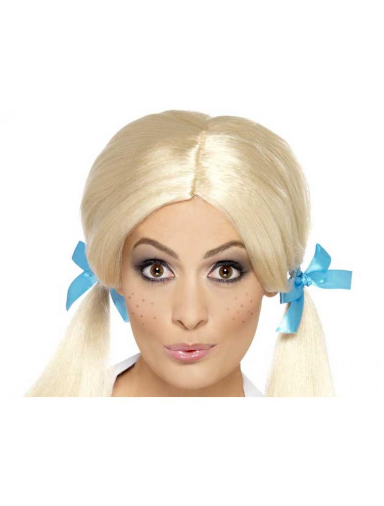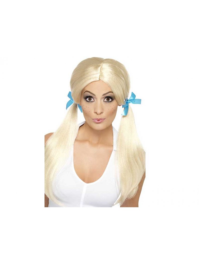 Peruca scolarita Sassy cu codite confectionata din par artificial blond, coafat in 2 codite neimpletite prinse cu fundite de satin albastru.
