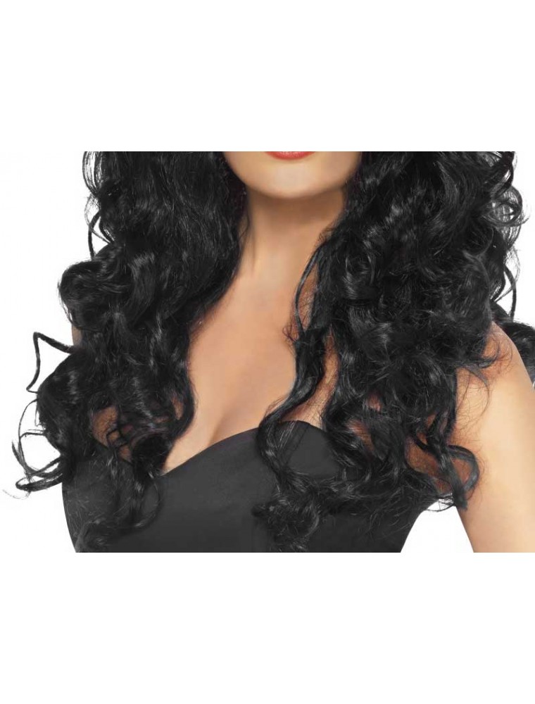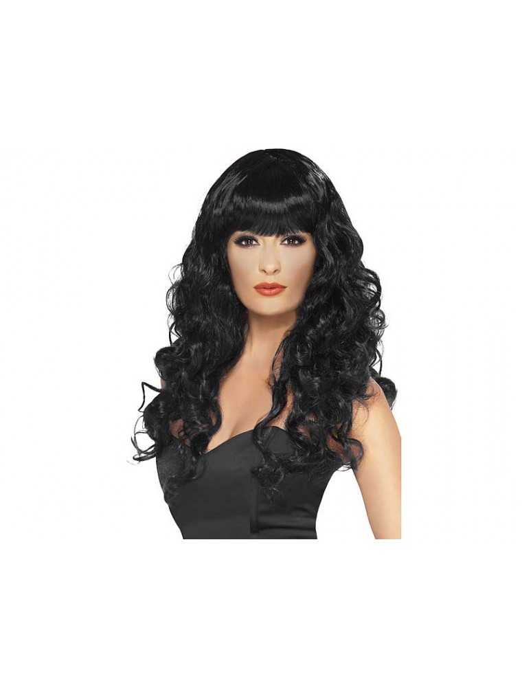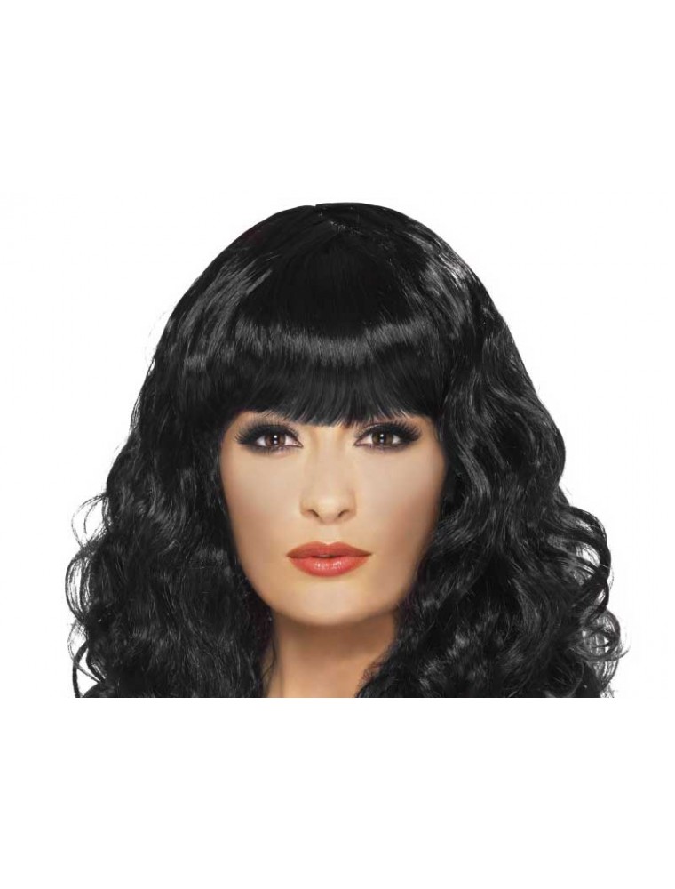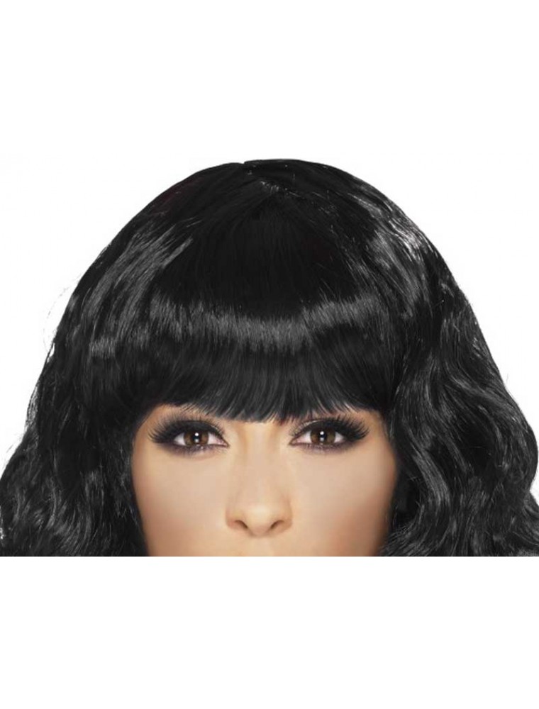 Peruca Sirena neagra confectionata din par artificial negru cu breton si suvite ondulate.